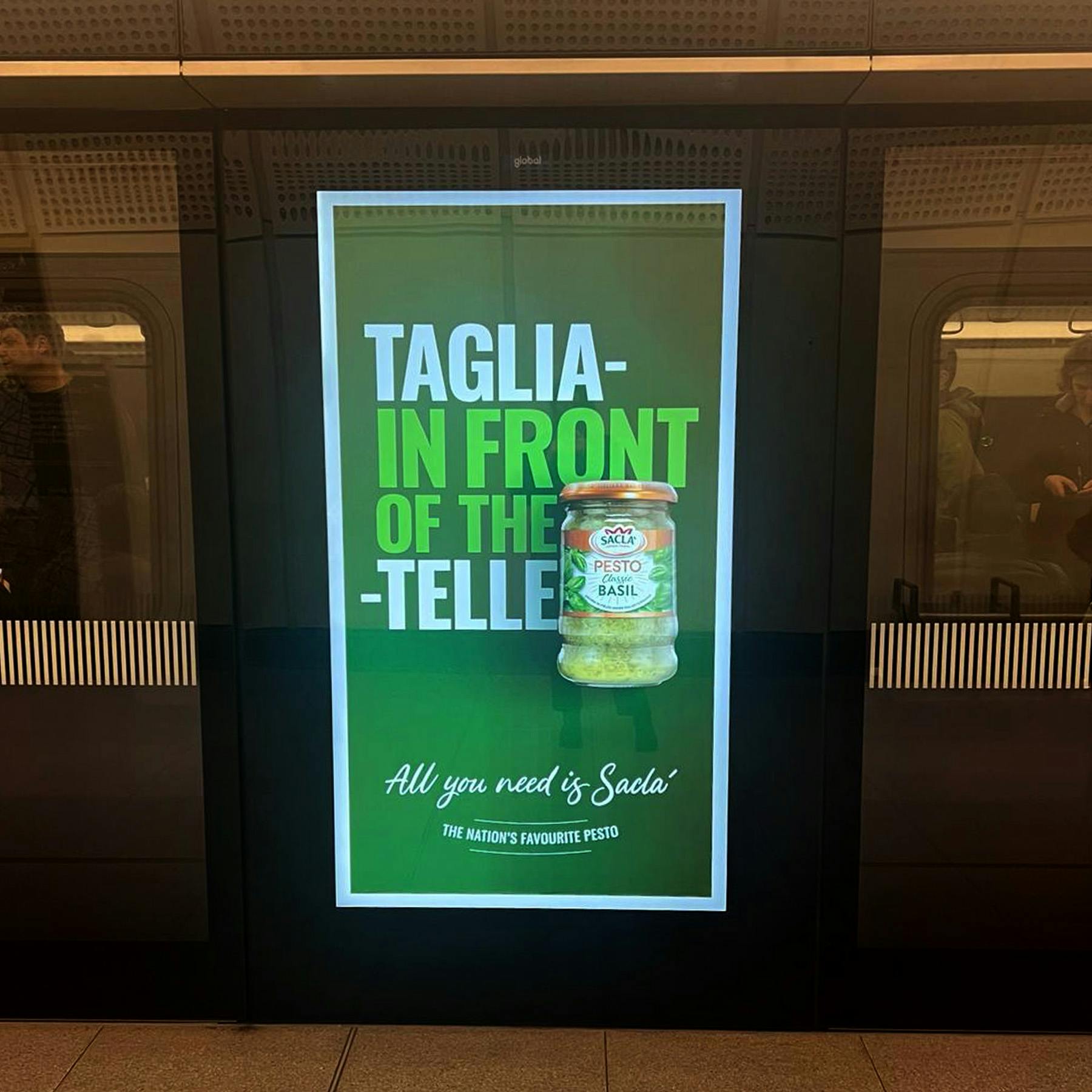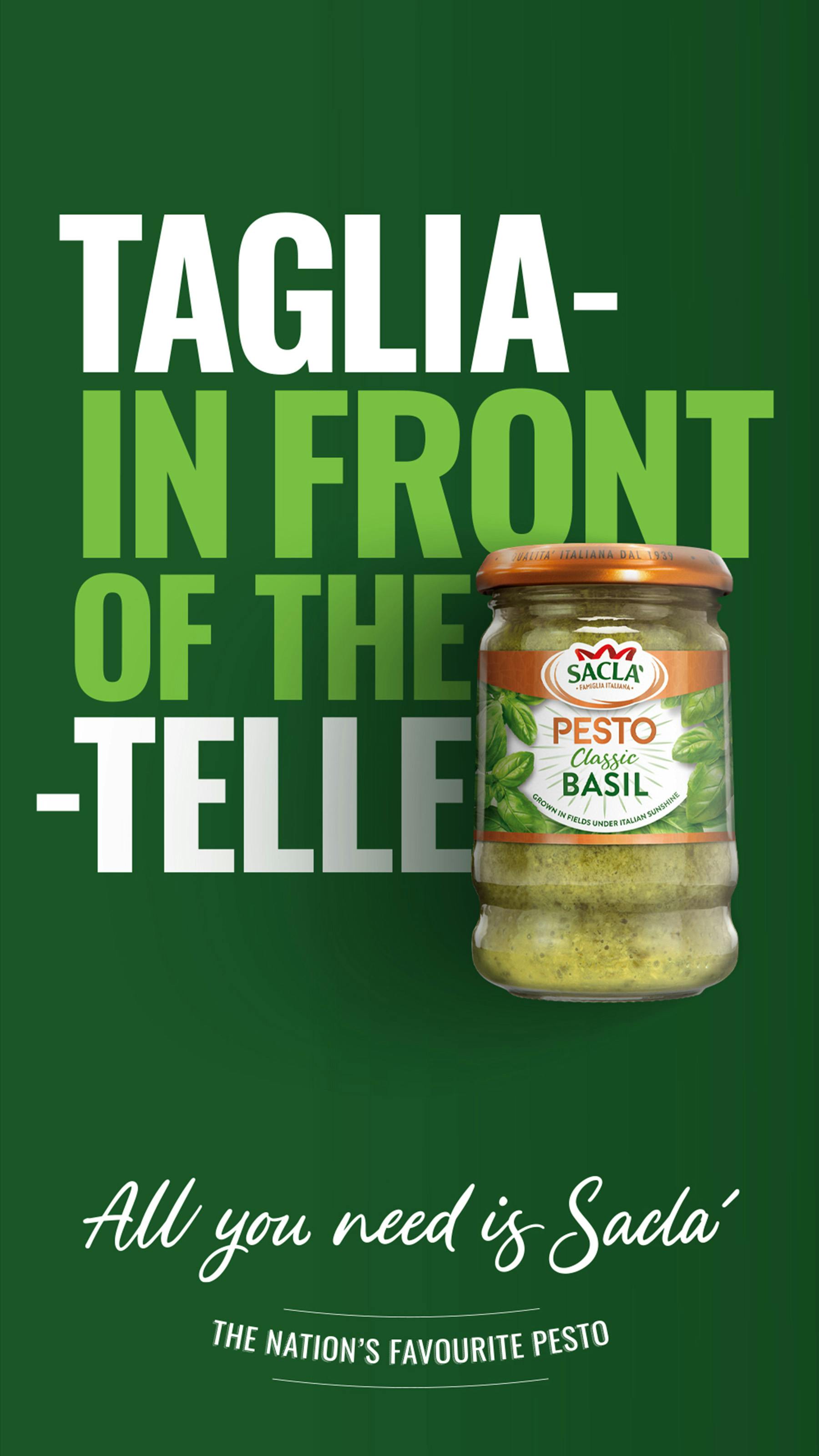 For the OOH, when all you need is Sacla’ to make a delicious meal, that’s all we added to our headlines. The jar slammed its way into the word pasta, completing the dish with the only 2 ingredients you need. In longer dwell time areas, headlines became more playful, tapping into the moments young people enjoyed meals together…. In front of the (taglia) telly!